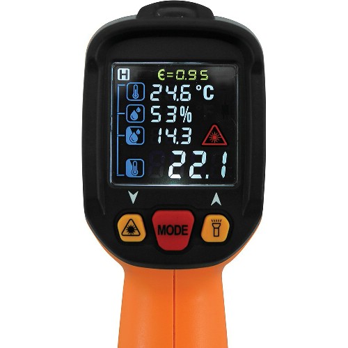 Beröringsfri och digital infraröd termometer för ett snabbt och tillförlitligt sätt att kontaktlöst mäta yttemperaturer på olika föremål och ytor. Kompakt storlek med LCD-färgskärm. Med många andra användbara funktioner som t.ex: Justerbar emissivitet, funktion för datahållning, valbara enheter för Celsius och Fahrenheit, inställning av larm för övre och nedre gräns: När det uppmätta värdet är större än omgivningstemperaturen + HAL-värdet eller mindre än omgivningstemperaturen + LAL-värdet tänds den röda indikatorn. Visar maxtemperaturen när den aktuella temperaturen visas. Kan samtidigt visa omgivningstemperatur, omgivande luftfuktighet, daggpunktstemperatur, emissivitet och yttemperatur. Möjlighet till termoelement av K-typ för mätning av kontakttemperatur. Kan användas för att bedöma om det uppmätta objektet lider av mögel eller inte beroende på skillnaden mellan dess yttemperatur och daggpunktstemperatur. UV-ljus kan användas för att upptäcka läckage i fordonets luftkonditionering och andra högtryckssystem. Drivs av 1 st 9 V batteri.