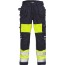 Flamskyddad varselbyxa i dammodell med inherent flamskydd. Metallfritt Multinorm-plagg för användning i bl a ATEX-miljöer. Smuts-, olje- och vattenavvisande. 2 Cordura-förstärkta löst hängande spikfickor, den ena med 3 fickor och verktygshällor och den andra med extra ficka. 2 framfickor. 2 Cordura-förstärkta bakfickor med lock och kardborrelås. Hammarhank. Cordura-förstärkt tumstocksficka med verktygsficka samt knapp och hälla för kniv. Benficka med lock och dold tryckknapp, telefonficka med lock, D-ring samt id-kortshållare i plast. D-ring vid linningen. Avtagbar ID-kortshållar (innehåller metall). Cordura-förstärkta knäfickor med öppning inifrån. Reglerbar höjd av knäskydden. Cordura-förstärkning i benslut. Reflexer påsydda med 2-nålssöm. Extra benupplägg, kan förlängas 5 cm. Tvätt 75°C.