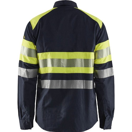 Inherent flamskyddad och metallfri multinormskjorta. Tillverkad i material som garanterar hög komfort och bidrar med behaglig passform och god rörlighet. Skjortkrage. Frontstängning med plasttryckknappar. Bröstfickor med lock och plasttryckknappar. Segmenterade, flamskyddade transferreflexer. Utvändiga certifieringsetiketter. Antistatisk kvalitet. Tvätt 60°C.