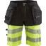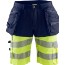 Varselshorts med 4-vägsstretch framtill och i oket bak. Tyg med vattenavvisande finish. Cordura-förstärkta spikfickor, bakfickor och tumstocksficka. Gylf med plastblixtlås. Hällor varav en med D-ring. Resår i midja. Förstärkt grensöm. Bakfickor med bälg. Benficka med bälg, lock, och pennficka, extra ficka, telefonficka och ID-kortsficka. Insticksfickor. Spikfickor - extra breda, försedda med verktygshankar, verktygsfack och extra fickor med dragkedja. Tumstocksficka med knivhållare och pennficka. 50 mm breda skurna transferreflexer runt ben. Tvätt 60°C.