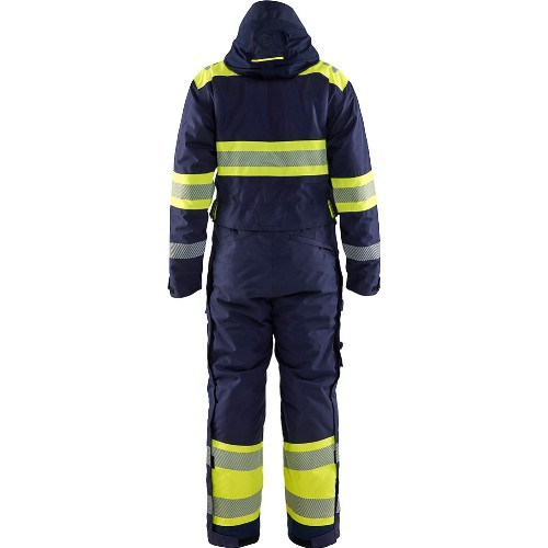 Vind- och vattentät vinteroverall i varselutförande med tejpade sömmar och quiltat foder. Bröstfickor med vattenavvisande blixtlås. D-ring i ena bröstfickan. Pennficka på ärm. Sidfickor med blixtlås. Bakficka med blixtlås. Innerficka i mesh med blixtlås. Benficka med lock och telefonficka. Tumstocksficka med knivhållare och pennficka. Avtagbar ID-kortsficka. Verktygsfickor i Cordura säljes separat. Hällor placerade på båda sidor bröst för placering av mikrofon och andra accessoarer. Karbinhake i metall. Avtagbar och justerbar huva anpassad för hjälm och hörselkåpor. Fleecefodrad hög krage med blixtlås. Frontstängning med dolt kraftigt tvåvägsblixtlås i plast och dubbel frontslå med kardborre. Meshpanel vid ärmhål och skulderblad. Tvåvägsblixtlås längs med hela sidsömmen. Resår i midja. Invändiga knäskyddsfickor. Snölås, öppningsbart med kardborre och knapp. 50 mm breda skurna transferreflexer på bål, ärmar och ben. Reflex på axlar. Reflextryck bak på huva. Vattenpelare 15000 mm, andasfunktion Ret 8,5. Tvätt 40°C.